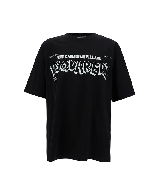 DSQUARED2 Black Crewneck T-shirt With Canadian Village Print In Cotton Man